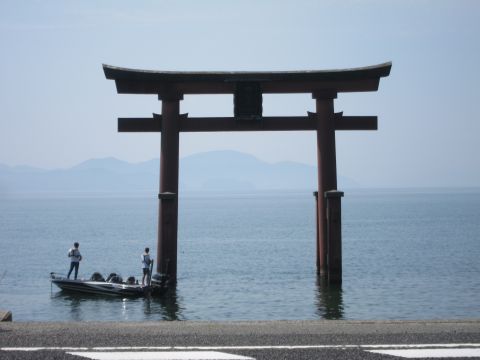 国道の向こう側、湖の上に大きな鳥居がありました。