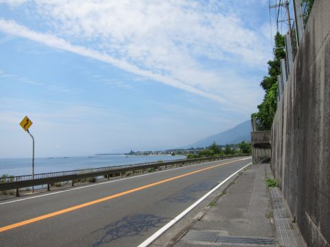 近江高島の町を後にして、湖沿いの道を走ります。横は崖。
