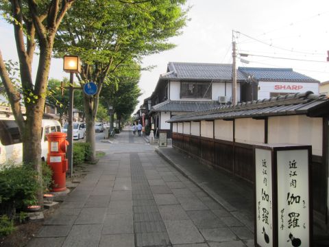 この街並み、高級そうな近江牛の店、昭和のポスト、SHARPの看板、の何とも言えない組合せ。